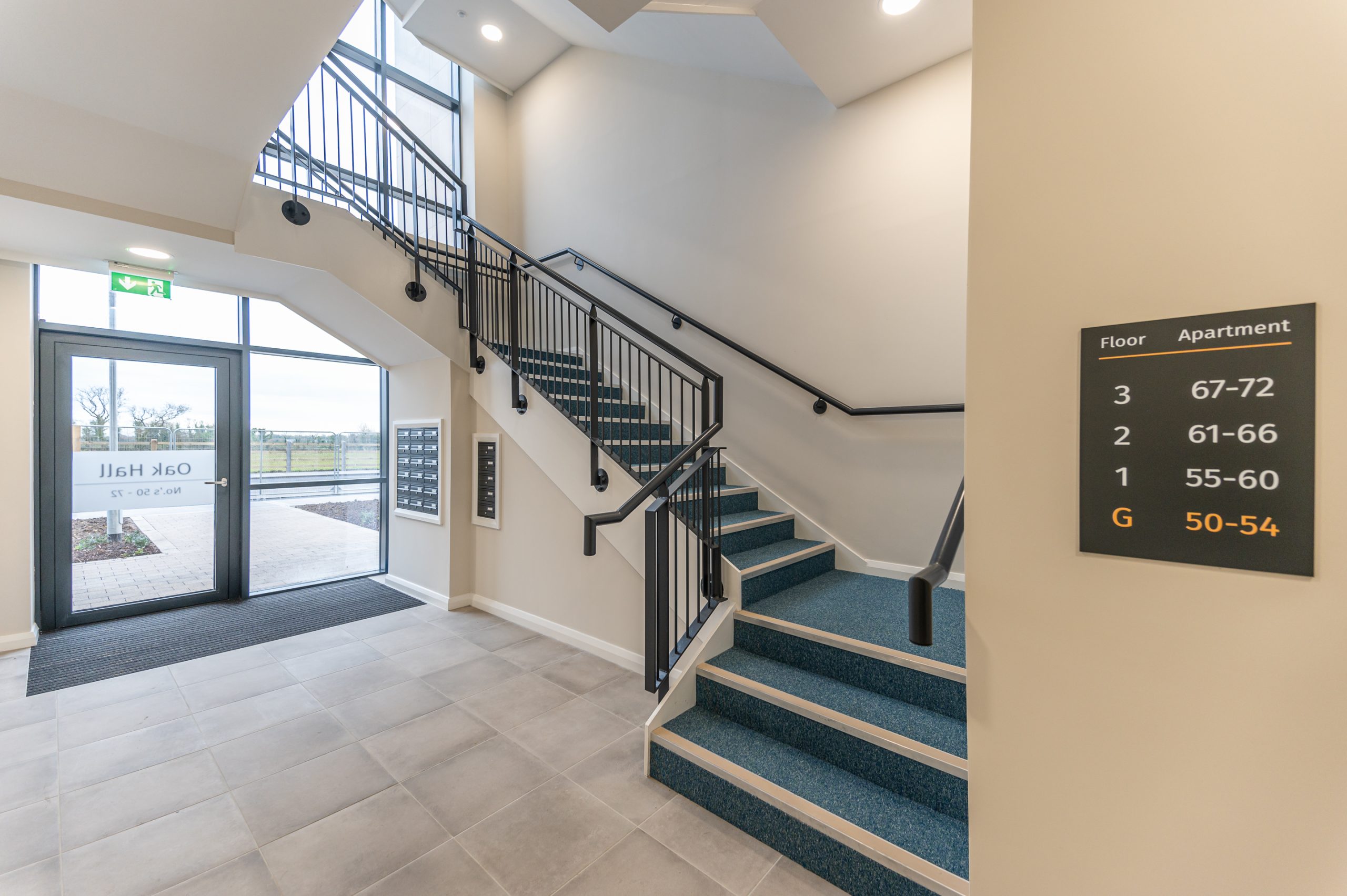 The apartment building rises four storeys above ground and features three stair cores, each with an associated lift. The site provides 90 car parking spaces, with 68 of these located in the undercroft car park and a communal landscaped area positioned above at first-floor level. All parking spaces were future-proofed for the installation of EV charging points.